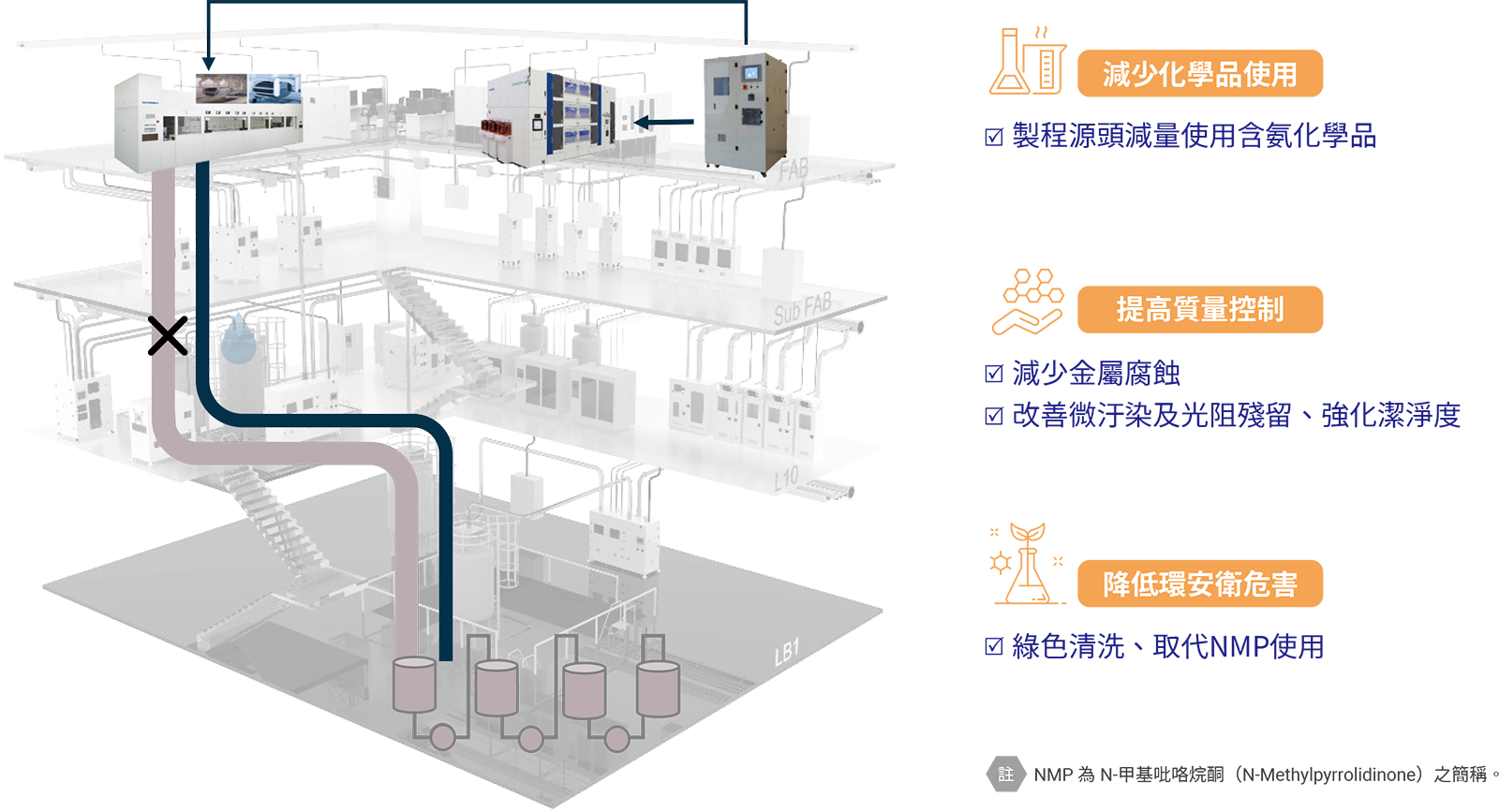 半導體產業濕製程處理已有數十年的發展進程,當中大宗使用的化學品如硫酸、磷酸、氫氟酸等等具有相當的危害性以及對環境的破壞,近年來的先進製程為求更細緻、更精準的控制效果,持續在化學品上下足苦工,再締造製程佳績的同時,卻也創造更多成分複雜、對環境破壞更嚴重的化學化合物。