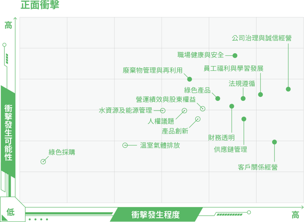 永續發展推動小組依 9 項重大主題相關的營運活動對經濟、環境及人群方面的衝擊強度、發生的可能性及瞭解重大主題在價值鏈的衝擊邊界,決定重大主題排序。